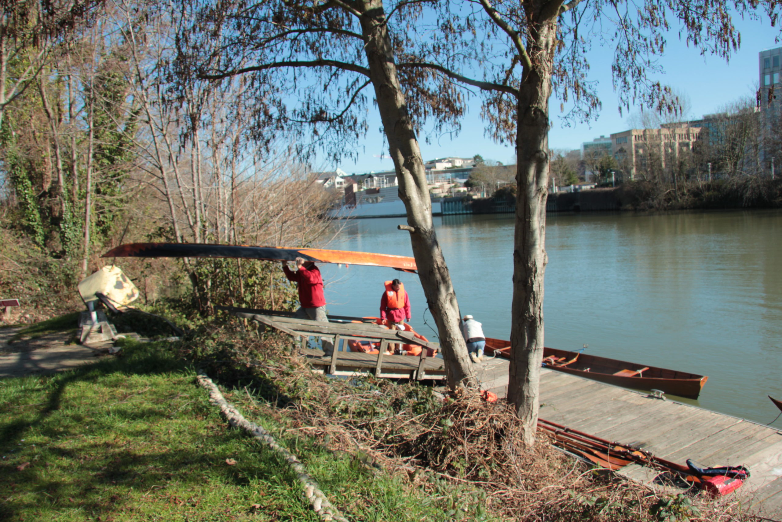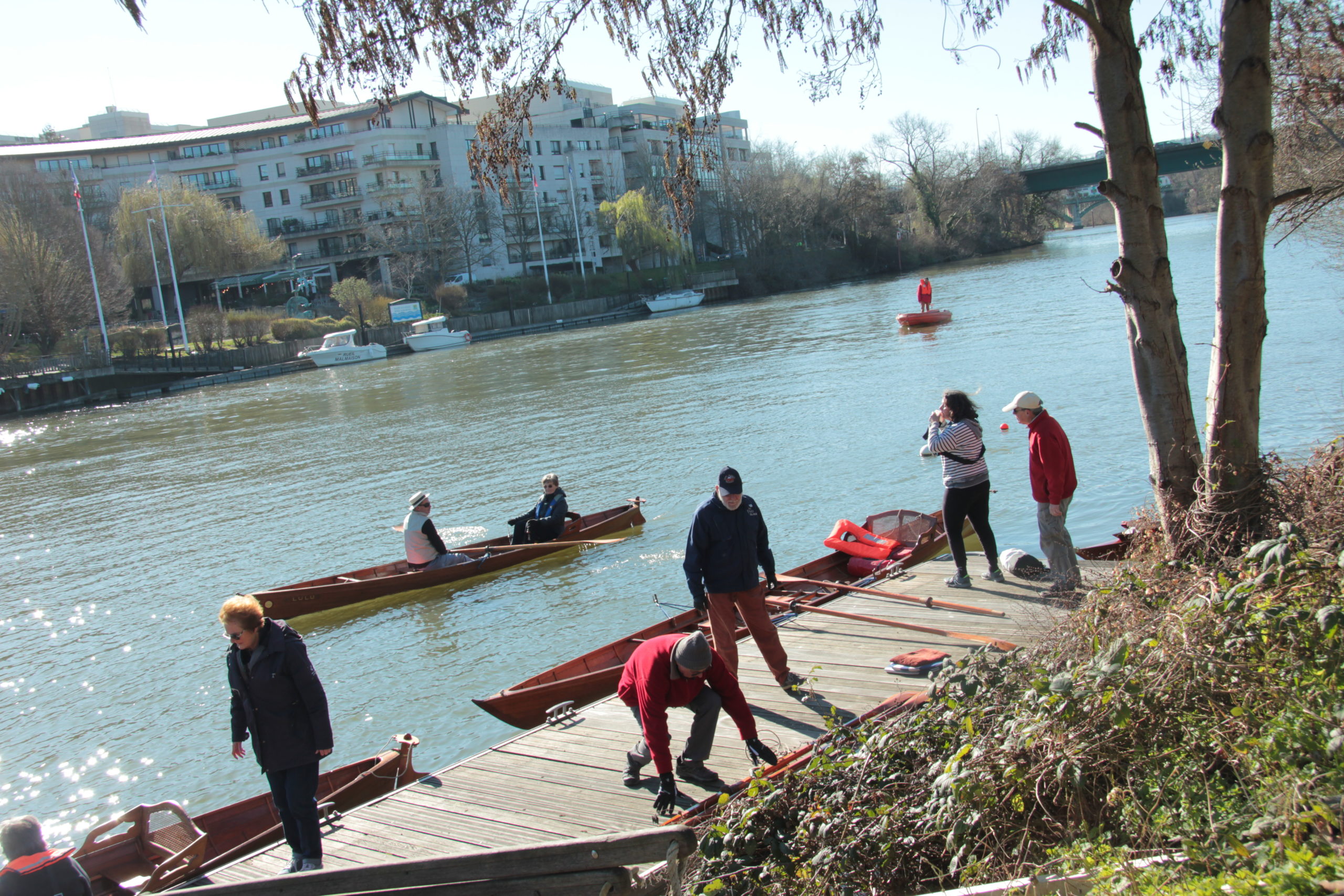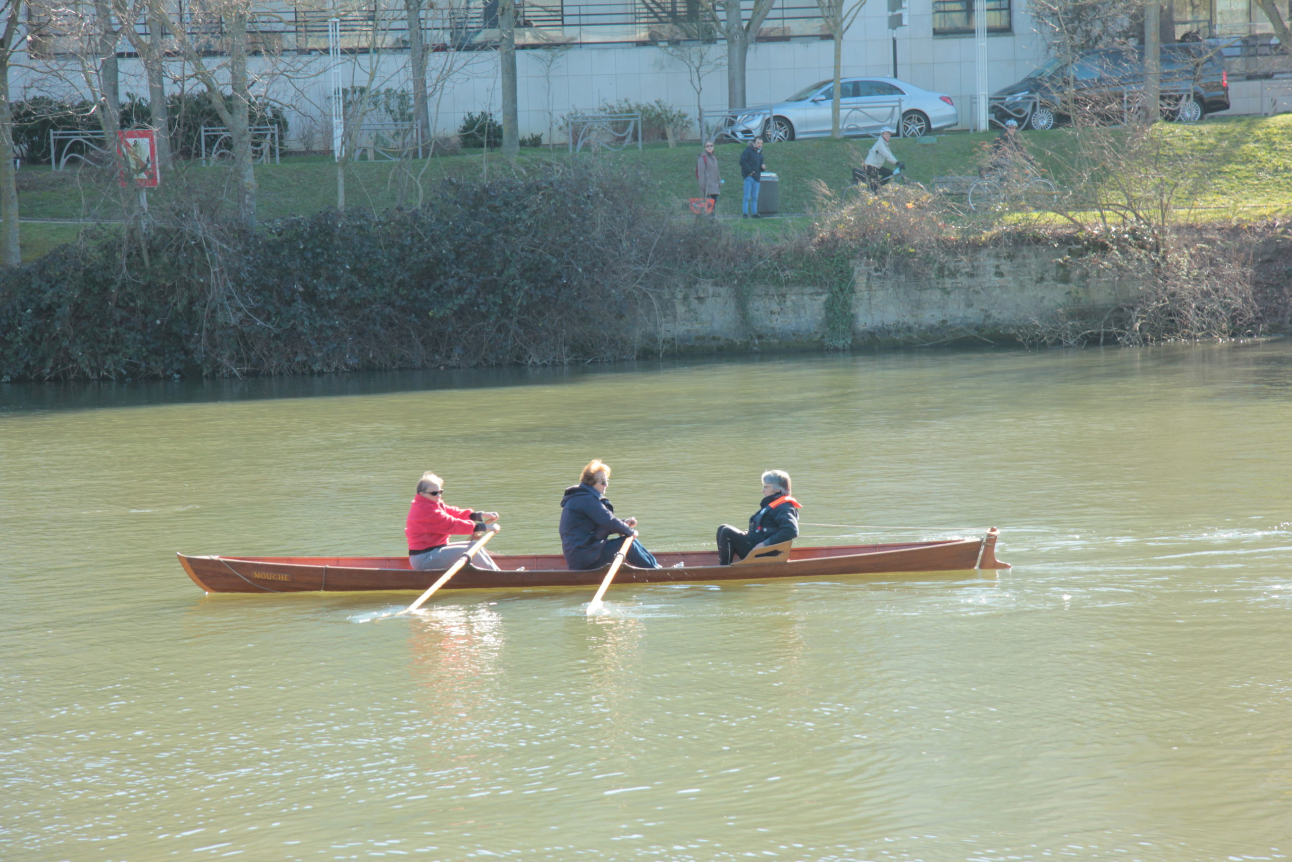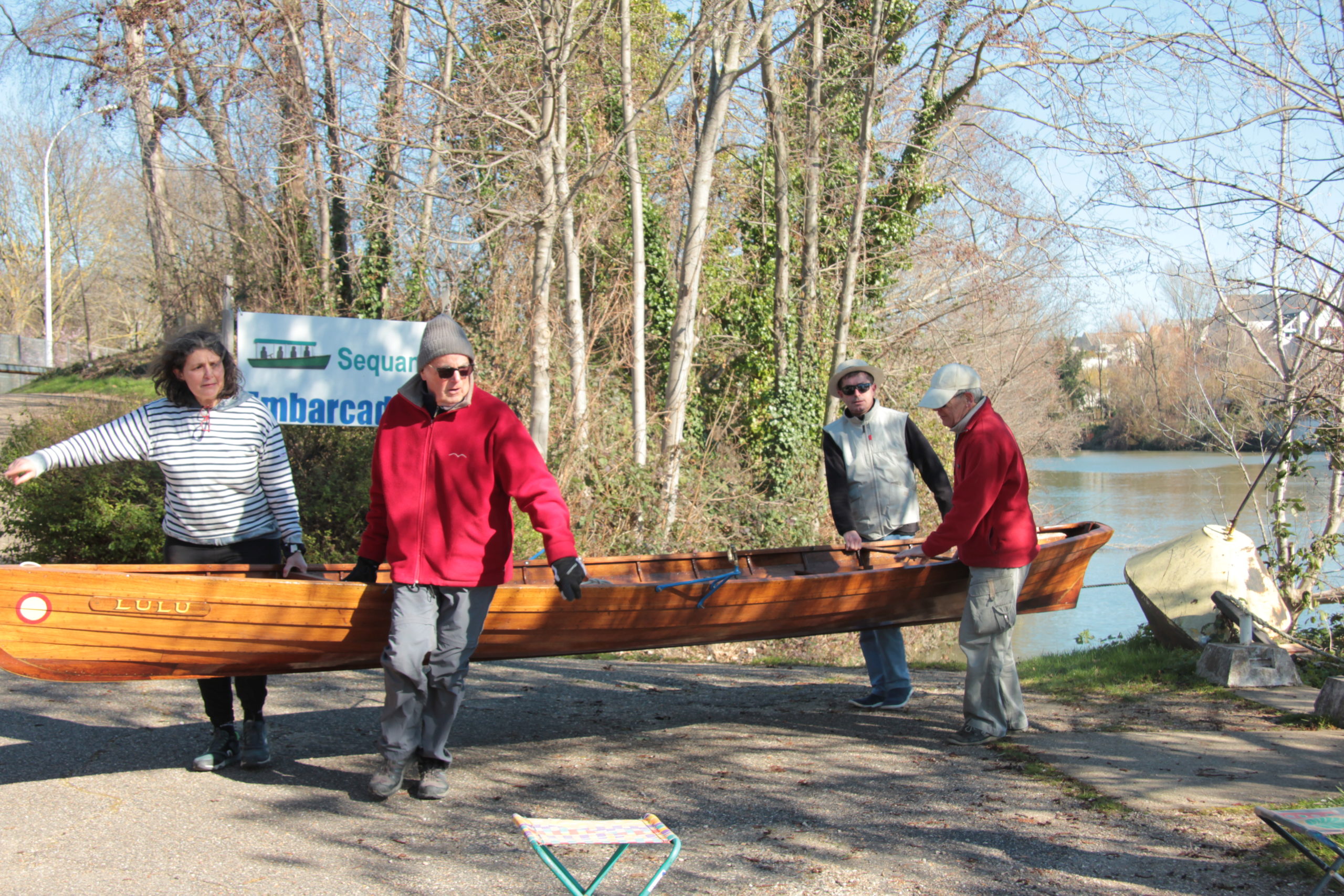 Grand soleil et ciel bleu en ce dernier dimanche de février; Kareen et ses amis d'avirons ont ouvert les doubles portes du garage à bateaux, et dégagé les 3 yoles choisies pour cette sortie pré-printanière, Mouche, Charentaise et Lulu.